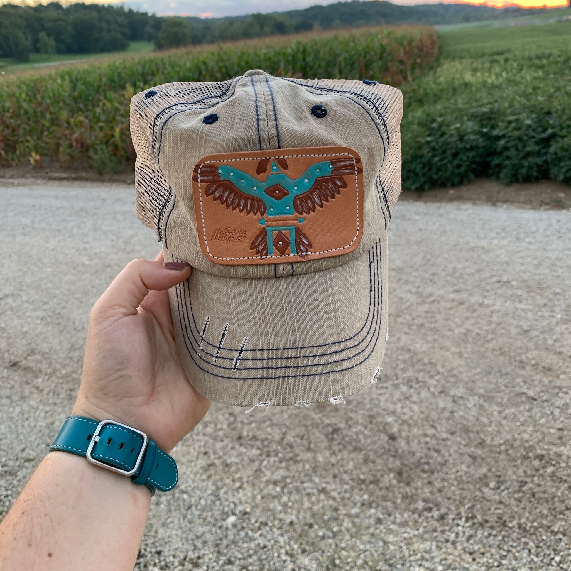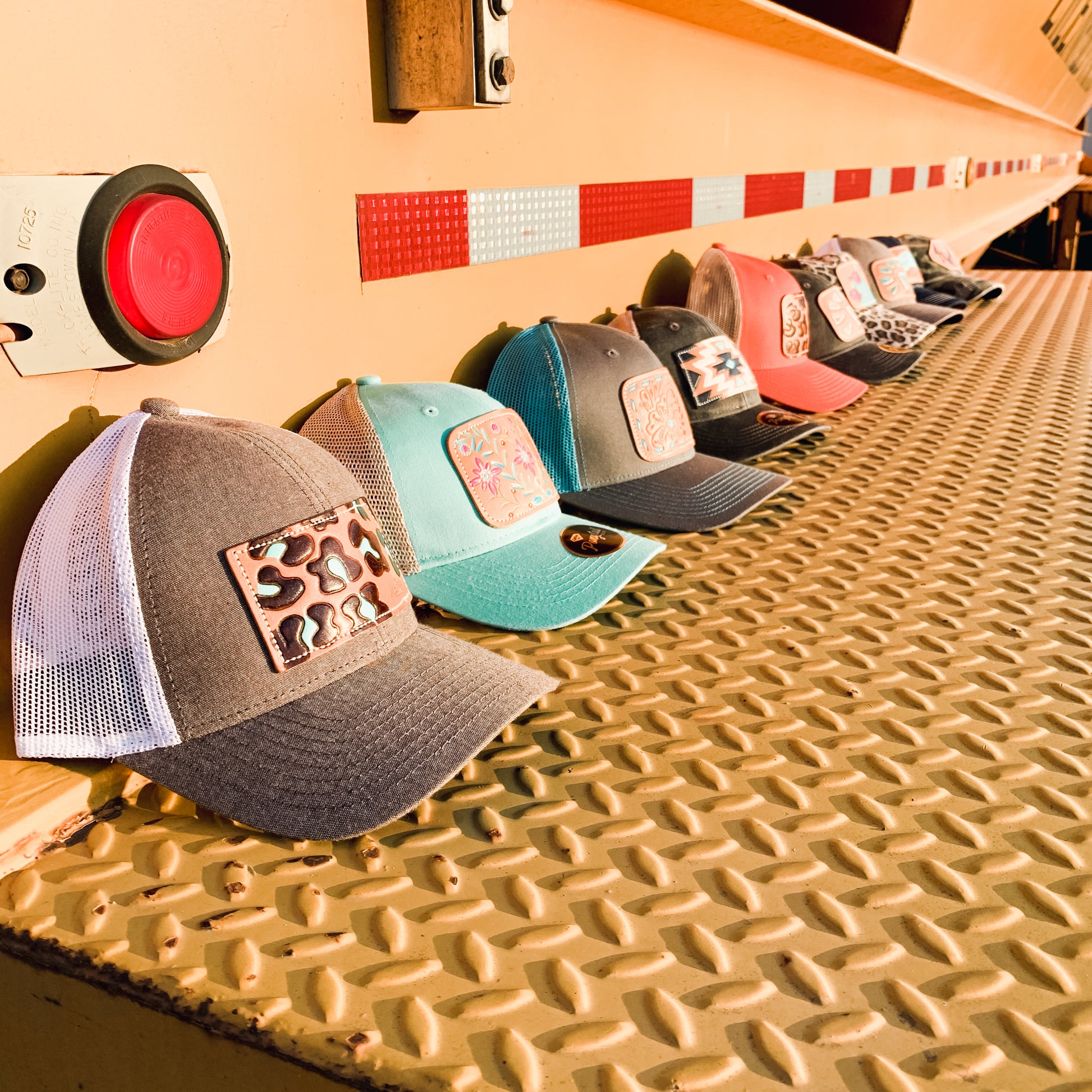 These hats, ya'll. The leather patches are each hand tooled and hand painted in Texas. They're the punchiest accessory on the market. Keep your head cool, but your face shaded in the cutest way possible this season.