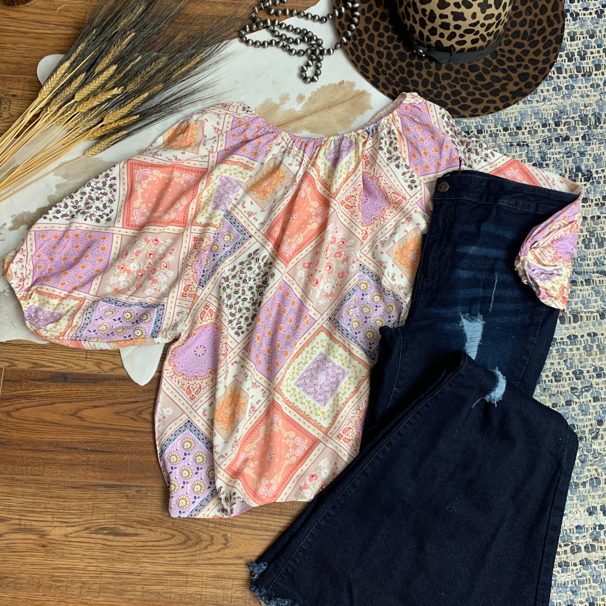 One top, so many options! Patchwork tops are so hot right now. The softness of the colors is balanced by wearing it off the shoulder for a more edgy look. Feminine and sweet meets edgy and bold. I love this top with a fitted pair of jeans and your cutest summer sandals.