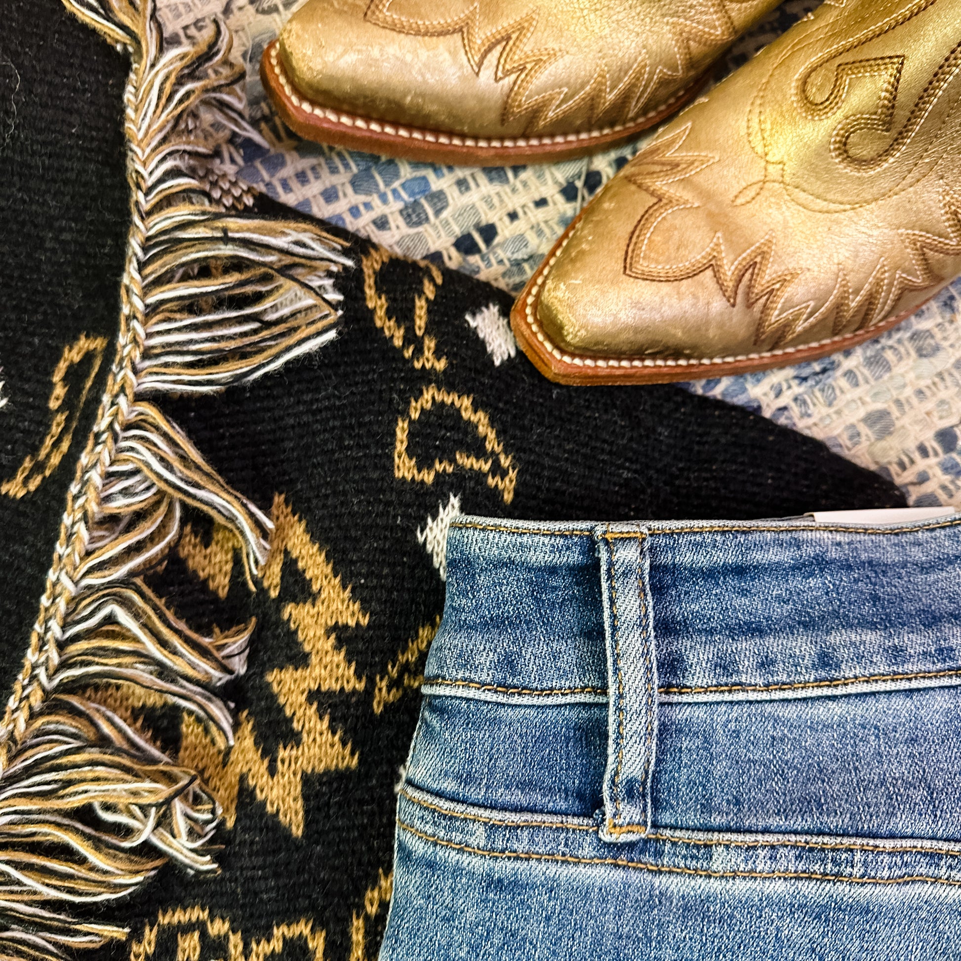 The Gambler is the ultimate sweater cardigan. This cardi features the fringe shaw collar. And if that's not western enough for you, just checkout the paisley and aztec knit design. We love the soft and neutral tones in the coloring. You'll feel quite posh wearing this sweater cardigan out to the honkytonks.
