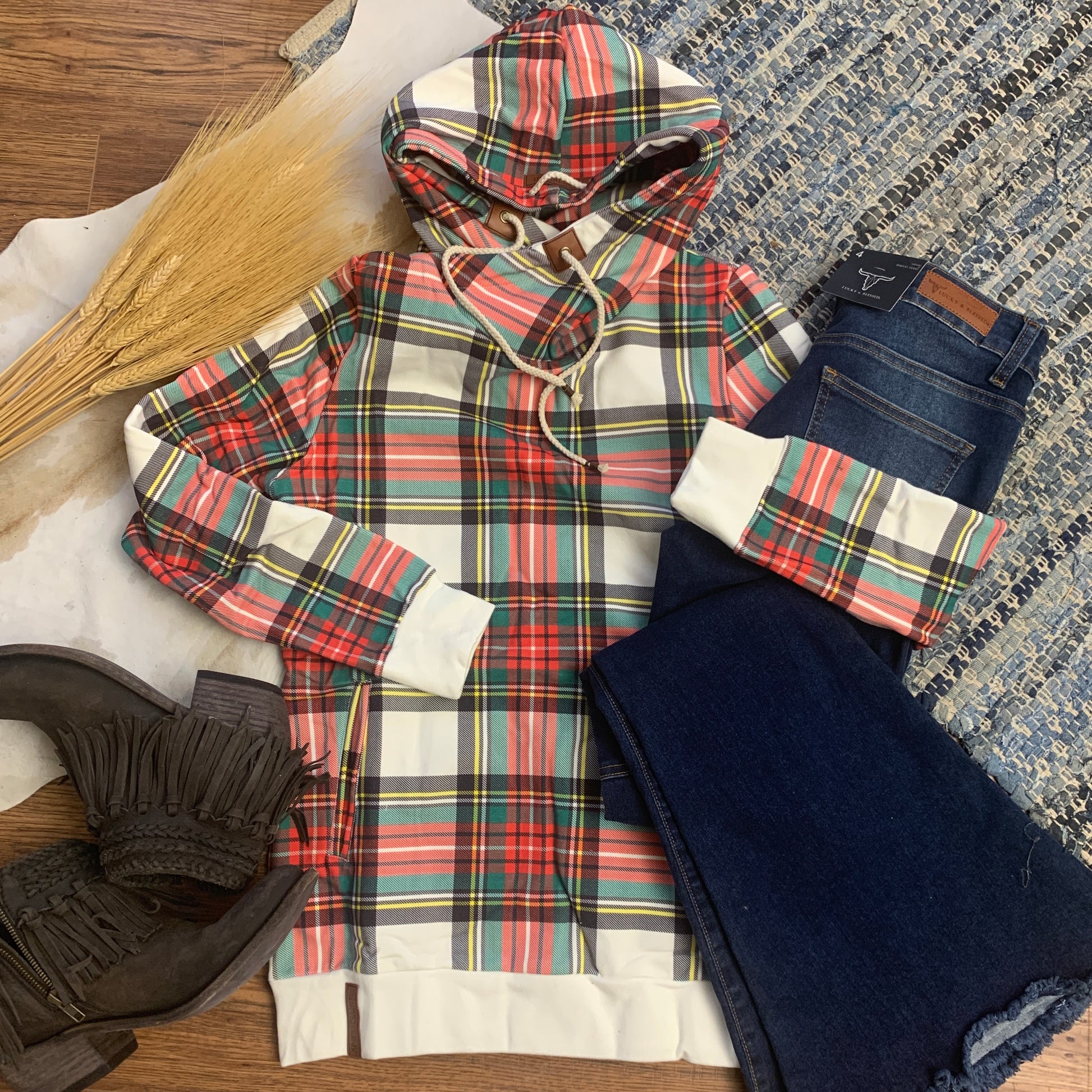 The Ampersand single hooded sweatshirt in this adorable Christmas plaid pattern will not disappoint. The single hooded sweatshirt is made of thick, but nicely stretchy fabric and has thick cuffs on the arms and waist. Layer this with a cute vest or jacket for all your outdoor holiday events!